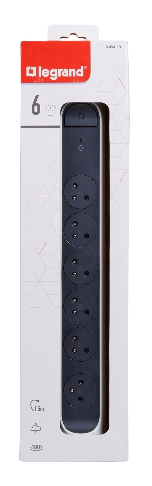 - 6"płaskich" gniazd 2P+Z (5 ustawione pod kątem 45° i 1 odsunięte i ustawione pod kątem 90° do podłączenia np. zasilacza bez blokowania sąsiedniego gniazda)
