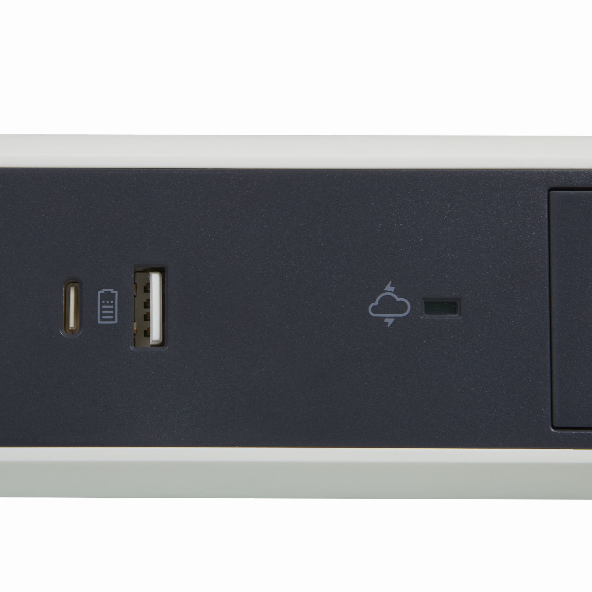 - 5 "płaskich" gniazd 2P+Z (4 ustawione pod kątem 45° i 1 odsunięte i ustawione pod kątem 90° do podłączenia np. zasilacza bez blokowania sąsiedniego gniazda)